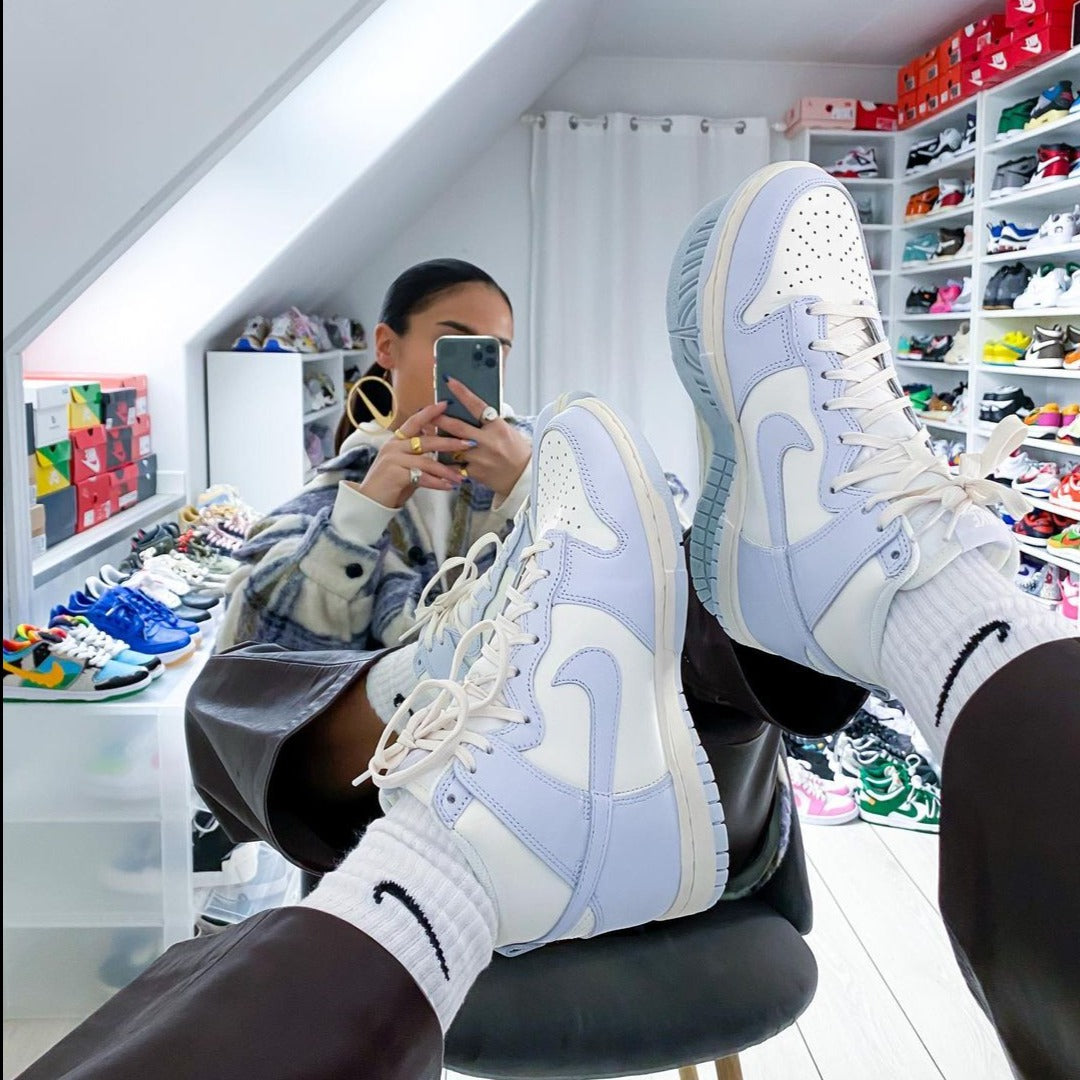 Description: The Nike Dunk High 'Football Grey' delivers an understated colourway of the retro hoops shoe originally released in 1985. featuring an outsole borrowed from the Air Jordan 1 and an upper design redolent of both the Air Jordan 1 and Nike Terminator. Here. the leather upper makes use of an off-white base with contrasting overlays in a subtle pale blue finish. A padded mesh collar combines with a nylon tongue to deliver a comfortable fit.