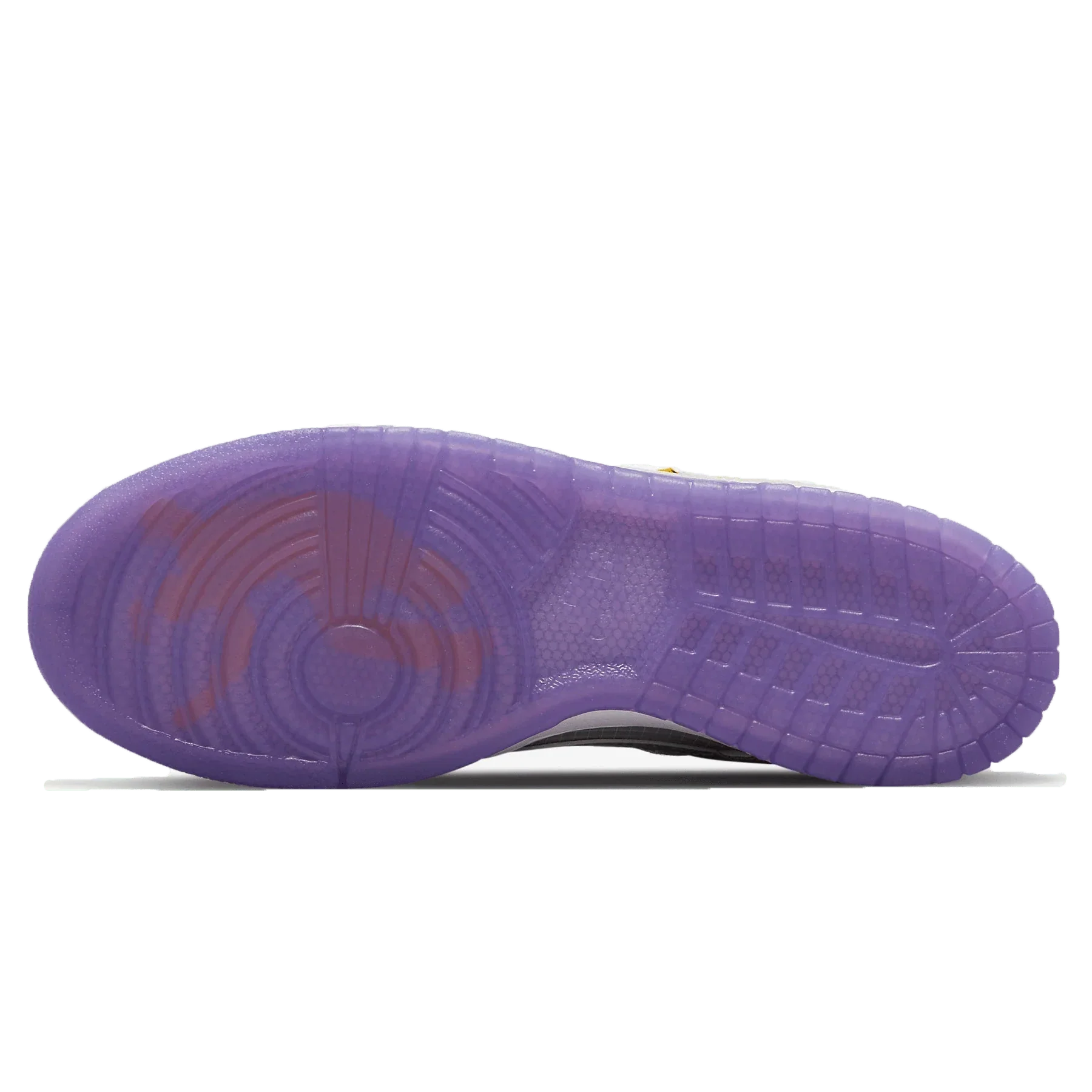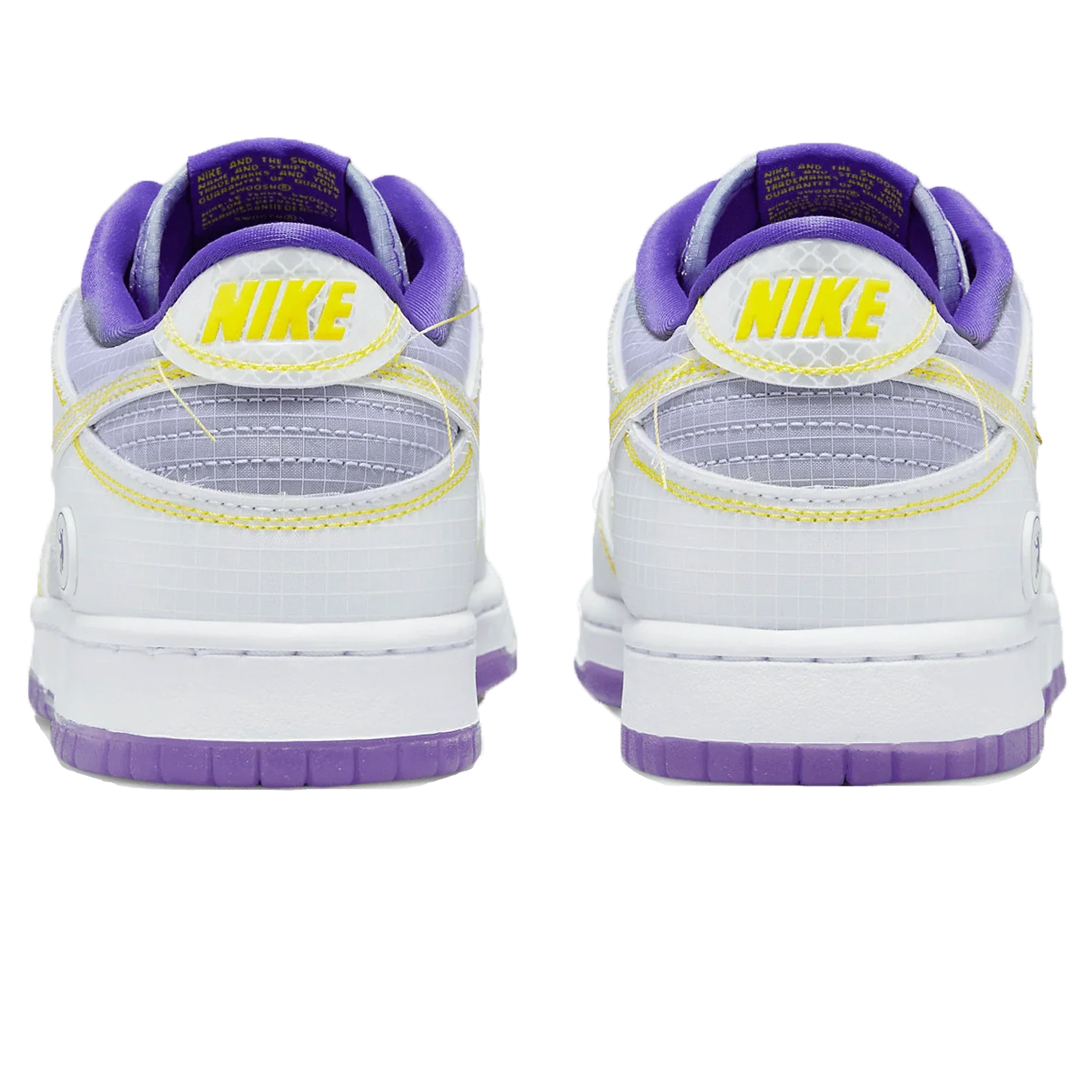 Description: The titular Purple of this shoe stands out on the top and the bottom. the lining. visible around the collar. and the semi-transparent outsole. The base of the upper is a cool grey in a see-through ripstop nylon with a white gridded pattern. The overlays on the toe cap. mudguard. eye stay panel. foxing and heel tab are made of the same material but in white. with visible yellow stitching. The profile Swooshes. with exposed yellow stitching as well. on both the medial and lateral sides are in grey but the grid on the material features a chain link design rather than a grid. The Union LA Frontman logo is in purple on the white button rivet tacked onto the lateral heel. An orange UN/LA tag is stitched onto the collar-side of the foxing. Like its other siblings. this pair has a large co-branded baggage claim hangtag. A white midsole and a translucent Purple outsole finish the shoe's look.